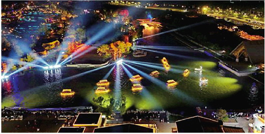 夜晚的渔田七里海度假区火树银花。