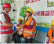 6月18日,在位于山东省济南市寨里镇的中建四局岩溶塌陷安置区项目施工现场“职工驿站”,工作人员为工人发放防暑药品。 新华社发