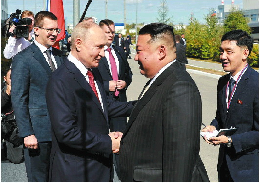 2023年9月13日,在俄罗斯阿穆尔州的东方航天发射场,俄罗斯总统普京与朝鲜最高领导人金正恩握手。 新华社/塔斯社