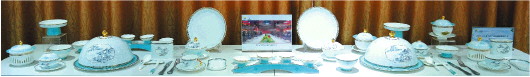 展厅内,与这组瓷具一同展示的皆是频频惊艳国内外的精品。登上央视龙年春晚的“五龙戏珠”春盘、北京奥运会限量礼品瓷、APEC官方机构合作限量瓷、2017年“一带一路高峰论坛”国宴用瓷,还有被选为英国威廉王子婚礼用礼品瓷、英国女王诞辰礼品瓷。