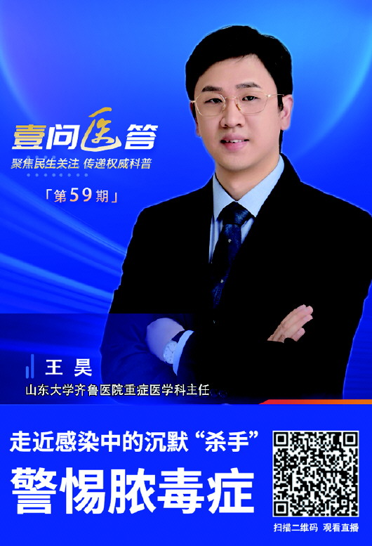 据统计,全球每年约有4000多万人感染脓毒症,死亡人数达1100万。6月20日12点30分,山东大学齐鲁医院重症医学科主任王昊做客“壹问医答”直播间,就脓毒症相关知识进行科普,帮助大家了解相关知识,提高健康素养。