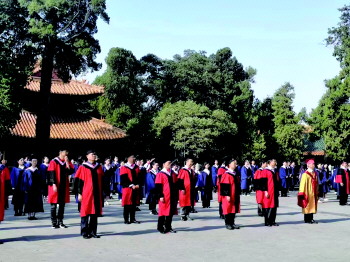 与会领导嘉宾与毕业生在孔庙内共同见证毕业典礼。