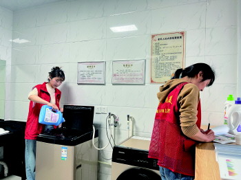 网格员在爱心洗衣房为辖区老人义务清洗衣物。