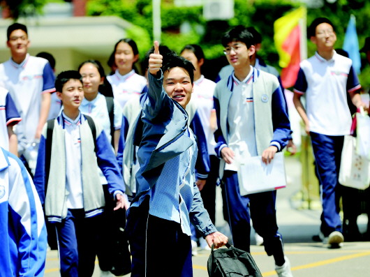 2024年济南中考结束,考生兴奋地竖起大拇指。