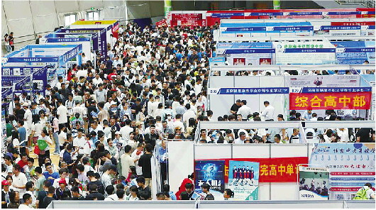 济南中招会现场异常火爆,各个学校咨询台前都围满了学生和家长。 王鑫 摄
