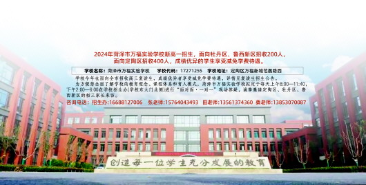 建校以来,菏泽市万福实验学校一直坚守“为党育人、为国育才”的初心使命,始终坚持党建引领,立德树人,五育并举,因材施教。学校课程丰富,活动多样,教育教学成效显著。2023年、2024年我校高考,在生源基础薄弱的情况下,通过师生不懈努力,均实现了“低进高出”,取得优异成绩,得到学生和家长的认可。