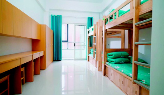 为了方便学生选课走班,菏泽市万福实验学校在教室门口为每位同学配备专门的橱柜,用来放置课本和学习用品。学生公寓为4人或6人间,配有衣柜和学习桌凳,有独立卫生间和洗浴室,装配空调和新风系统,24小时供应热水。学生食堂绿色环保、品类丰富、营养均衡,学生可根据自己的口味自由刷卡点餐。
