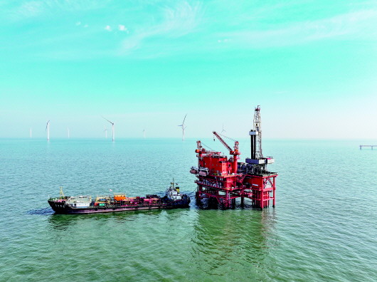 胜利海上油田顺利完成埕北6GB-12大斜度井细分五段注水作业。针对该井斜度大、油层埋藏深、分注层段多的特点,胜利油田海洋采油厂相关技术部门优化采用有缆式智能分层注水工艺,精细把控每道施工工序质量,顺利完成细分五段注水作业,实现海上大斜度井精细分层注水新突破。图为黄河彩虹施工船舶正在配合埕北6GB平台进行措施作业。 本报记者 顾松 通讯员 张灿 摄影报道