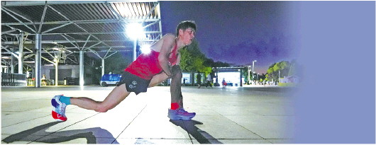 ◤6月24日,北京奥林匹克森林公园,栾玉帅在跑步训练后进行肌肉拉伸。 新华社发
