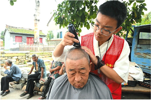 李岩松的理发手法很娴熟,几分钟就能给一位老人理完发。