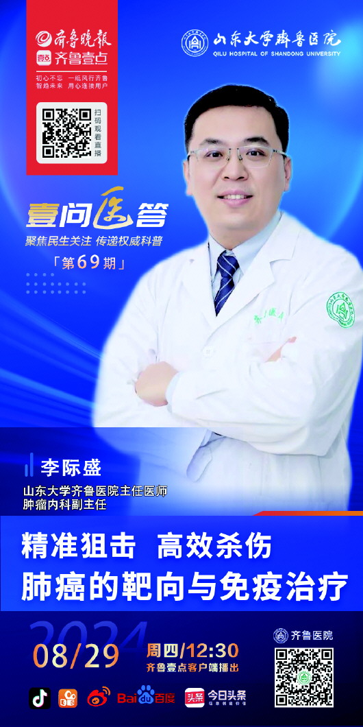 国家癌症中心2024年发布的最新数据显示:2022年,我国新发癌症病例约为482.47万例,其中肺癌新发病例数为106.06万例,在中国人群癌症中占首位,是我国最常见的癌症类型。在肿瘤发展的不同阶段,肺癌的治疗手段有哪些,靶向治疗与免疫治疗又能给患者带来哪些新希望?8月29日12:30,山东大学齐鲁医院主任医师,肿瘤内科副主任李际盛做客“壹问医答”直播间,围绕肺癌的靶向治疗与免疫治疗等内容进行科普,帮助大家对肺癌治疗有更全面的了解。