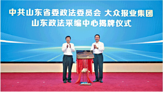 8月29日下午,山东省委政法委与大众报业集团战略合作签约仪式暨大众政法大平台建设应用推进会在济南举办。山东省委政法委分管日常工作的副书记孙成良(左),大众报业集团(大众日报社)党委书记、董事长、社长毕司东共同为“山东政法采编中心”揭牌。大众政法大平台由山东省委政法委统筹组织全省政法机关,联合大众报业集团共同打造,由齐鲁晚报·齐鲁壹点具体运营。定位为构建“新闻+政务+服务”综合平台,建成全省政法舆论主阵地。目前,全省623个政法大众号上线,“政能量”充盈,大流量澎湃。 记者 戴伟 王媛 摄