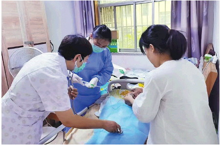 近日,济南市人民医院中格病区护理人员走进老市医院宿舍区,为长期卧床的刘大爷更换胃管置管。刘大爷气管切开置管难度大,护理人员以娴熟的操作技术为患者测量生命体征、经过综合评估,顺利置入胃管。