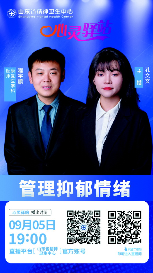 为了帮助大家更好地认识和理解抑郁情绪,掌握有效的情绪管理方法,9月5日19点,山东省精神卫生中心康复医学科医师程宇鹏做客“心灵驿站”直播间,以“管理抑郁情绪”为主题,进行科普讲座,敬请关注。