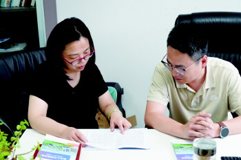 马翠(左)和同事讨论工作。