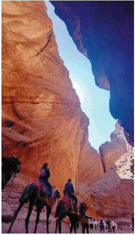 骑骆驼的游客穿过峡谷。