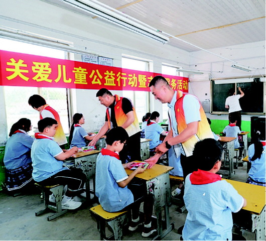 福彩公益志愿者为农村儿童、留守儿童送去礼物和图书。