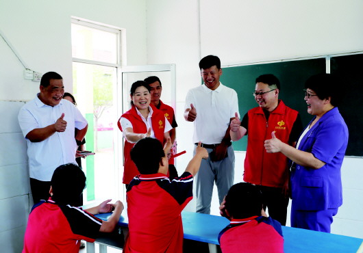 在莒南县新光启智学校(特殊教育),志愿者们走进教室与孩子们互动交流。