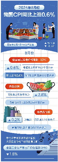 国家统计局9日发布数据显示,8月份,全国居民消费价格指数(CPI)同比上涨0.6%,涨幅比上月扩大0.1个百分点;全国工业生产者出厂价格指数(PPI)同比下降1.8%,国内物价总体保持基本平稳。