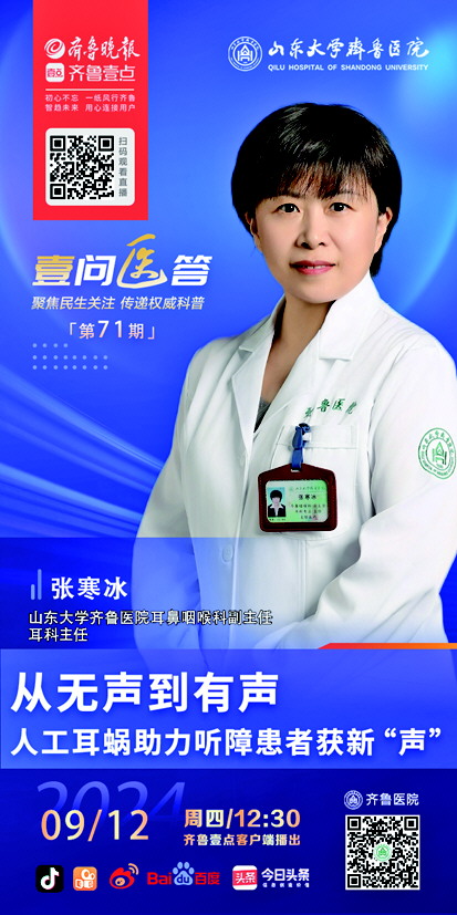 人们常说“耳聪目明”。但有这样一群人,他们虽看得见缤纷世界,却感知不到世界的声音。幸运的是,人工耳蜗的出现,为他们提供了聆听世界的机会。人工耳蜗是否适应所有的听障人士,植入人工耳蜗的患者是否能够立刻听到世界的声音,低年龄段的宝宝植入人工耳蜗后能否正常地学习说话……9月12日,山东大学齐鲁医院耳鼻咽喉科副主任、耳科主任张寒冰做客“壹问医答”直播间,就人工耳蜗相关话题进行科普,敬请关注。