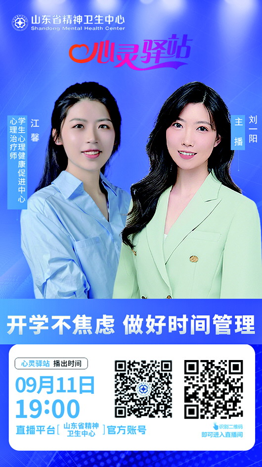 9月11日19点,山东省精神卫生中心学生心理健康促进中心心理治疗师江馨做客“心灵驿站”直播间,以“开学不焦虑,做好时间管理”为题进行专题讲座,带领学生与家长朋友,一起告别开学焦虑,敬请关注。