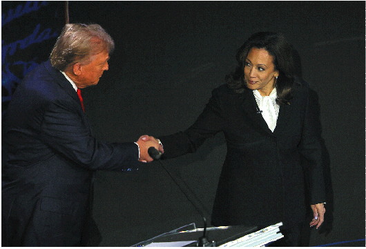 当地时间9月10日,美国宾夕法尼亚州费城,特朗普(左)和哈里斯在首场电视辩论前握手。 IC photo