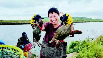 中秋前夕,青岛市即墨区田横镇丁字湾海域万亩蟹田迎来丰收季。今年螃蟹个大鲜肥,单只重量半斤左右,目前主要以收获公蟹为主,母蟹要等到10月下旬开始收获,预计当地今年养殖梭子蟹总产量将达到140万斤。养殖户介绍,因今年海捕蟹产量低,养殖梭子蟹行情一路走高,目前,单只4到6两重的螃蟹收购价每斤从65元到80元不等。 宋祖锋 摄影报道