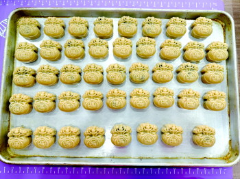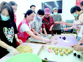 活动现场,面点老师为大家一一介绍饼皮、馅料、模具等制作材料的用量和制作方式,并详细指导月饼的制作过程。大家动手揉饼皮、加馅料、包月饼、放入模具按压成型,一边探讨着月饼的制作方法,一边互相传递鲜花、花生、葫芦、小兔子等形状的月饼模具。经过近一小时的制作,一个个色泽鲜艳、小巧玲珑的月饼呈现在每个人的手中,并由社区工作人员组织集体合影留念,定格美好瞬间。此次活动,拉近了邻里之间的距离,传递了团圆和谐的吉祥寓意,提升了辖区居民的幸福感、归属感。