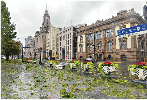 9月16日,上海外滩附近道路落满吹落的枝叶。 新华社发