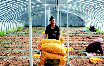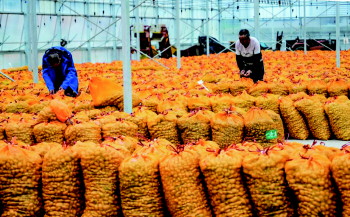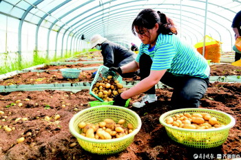 农户在内蒙古乌兰察布商都县希森马铃薯繁育大棚收获原原种薯。