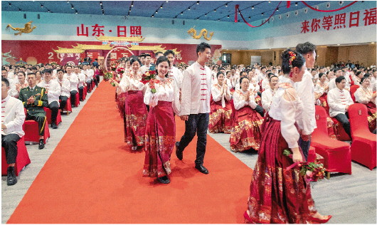 “很开心今天能够参加集体婚礼,和全国各地新人一起分享喜悦和幸福,共同见证人生中重要的时刻,未来将会成为我们宝贵的人生记忆。”9月22日,“家国同庆 见证幸福”2024年全国万人集体婚礼山东省日照市分会场活动在日照国际博览中心举行。现场228对新人身着中式婚服,举行了简约浪漫的中式传统集体婚礼,感受传统文化魅力,倡导婚事新办的文明新风。婚礼在北京主会场、各省区市和新疆生产建设兵团49个分会场同步进行,来自全国各省区市和港澳台地区的5100多对新人参与。 郑玥 刘涛 摄影报道