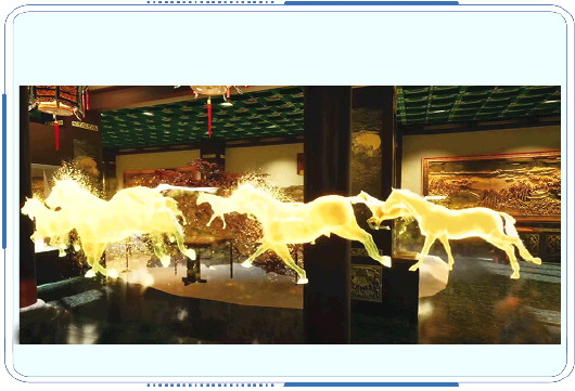 数字技术与文化的碰撞,正在成为现实。走近《万马奔腾》木雕,作品介绍便自动映入眼帘。紧接着,眼前的木雕“动”起来了:金色的马群奔腾,四蹄翻腾,长鬃飞扬,海潮般呼啸奔腾。炫酷的效果与木雕融为一体,生动壮美,AI导游随即开始智能语音解读:《万马奔腾》木雕采用一块千年金丝古香樟雕刻,形态各异的五十六匹骏马,代表五十六个民族,寓意民族团结、国家繁荣昌盛……