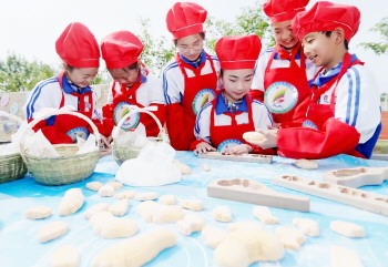 孩子们在“非遗课堂”上体验制作面食。