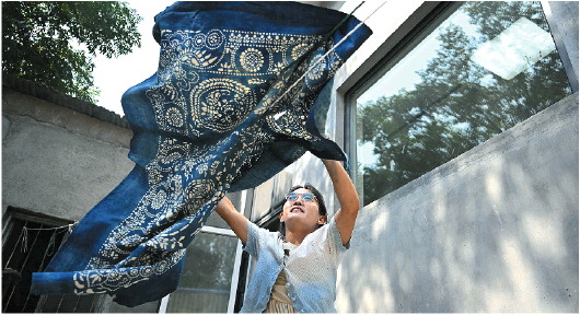 王英将染好的蓝印花布进行晾晒。