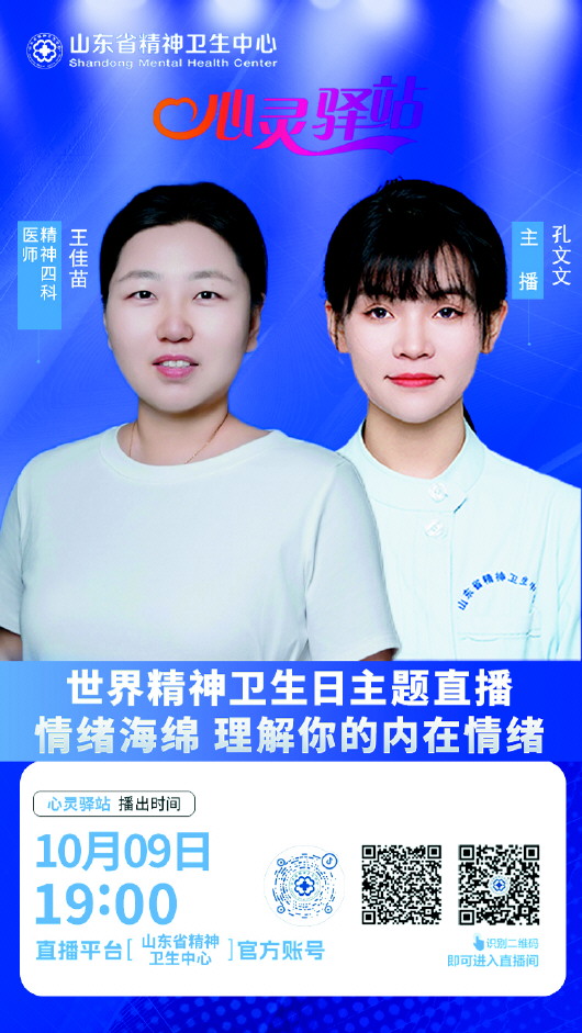 10月9日19点,山东省精神卫生中心精神四科医师王佳苗将以“情绪海绵——理解你的内在情绪”为主题,围绕“情绪海绵”及大众关注度较高的焦虑抑郁等话题进行科普讲座,敬请关注。