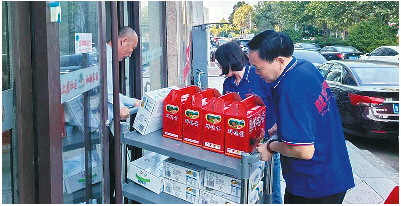 ◥王洪玉(左)帮助服务中心工作人员把礼物运上楼。