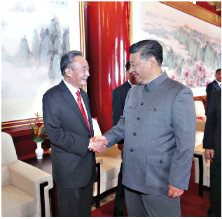 2021年7月1日,庆祝中国共产党成立100周年大会在北京天安门广场隆重举行。这是庆祝大会前,习近平同志与吴邦国同志握手。