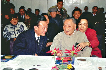 1992年2月10日,邓小平同志在上海贝岭微电子制造有限公司参观时与吴邦国同志交谈。