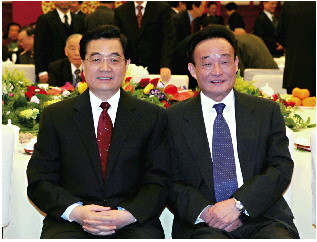 2005年1月1日,全国政协在北京举行新年茶话会。这是胡锦涛同志与吴邦国同志在一起。 图片据新华社