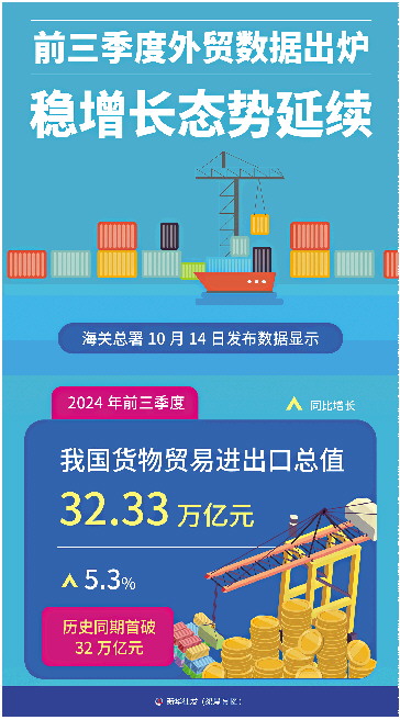 我国外贸最新数据10月14日出炉。据海关统计,今年前三季度,货物贸易进出口总值32.33万亿元,同比增长5.3%,其中,出口、进口分别增长6.2%、4.1%。