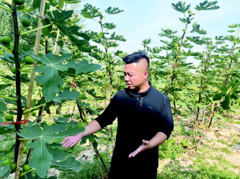 姜兆峰在果园里检查无花果。