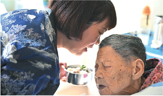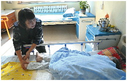 闫敏正在为老人按摩,让老人身体舒服一些。