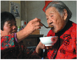 “早上豆浆泡小米煎饼,一个煮鸡蛋。中午、晚上,家里吃什么,婆婆就跟着吃什么,从不挑食。婆婆特别喜欢喝粥,现在每天中午晚上都要喝两碗。”马桂美介绍,婆婆不大喜欢吃甜食。过去,婆婆还有点血压高,现在竟然好了,平时也很少到卫生室拿药。现在,老人除了耳聋,走路不便外,穿衣吃饭还需要别人帮忙,其他身体指标都不错。