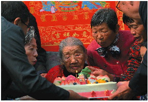 这天是刘桂香老人106岁的生日。亲戚从四面八方专程赶来祝寿。一大早,刘桂香老人住的西屋墙上,就挂上了寿星中堂和祝寿楹联。老人也穿上满是“福”字的新衣服,喜庆又吉祥。“比过年还热闹。”家中女主人、刘桂香的大儿媳妇马桂美说,“过年也没有这么多人”。