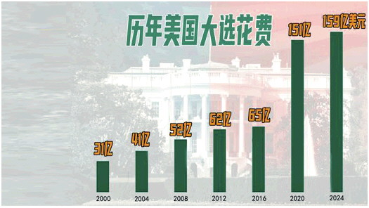“美国的政治体系靠钱运转——而且是大量的钱。”据彭博社当地时间11月1日报道称,1.1万个政治团体为美国2024年大选活动花费了147亿美元。