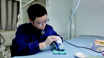 济宁市博物馆文物修复师正在修复瓷器。