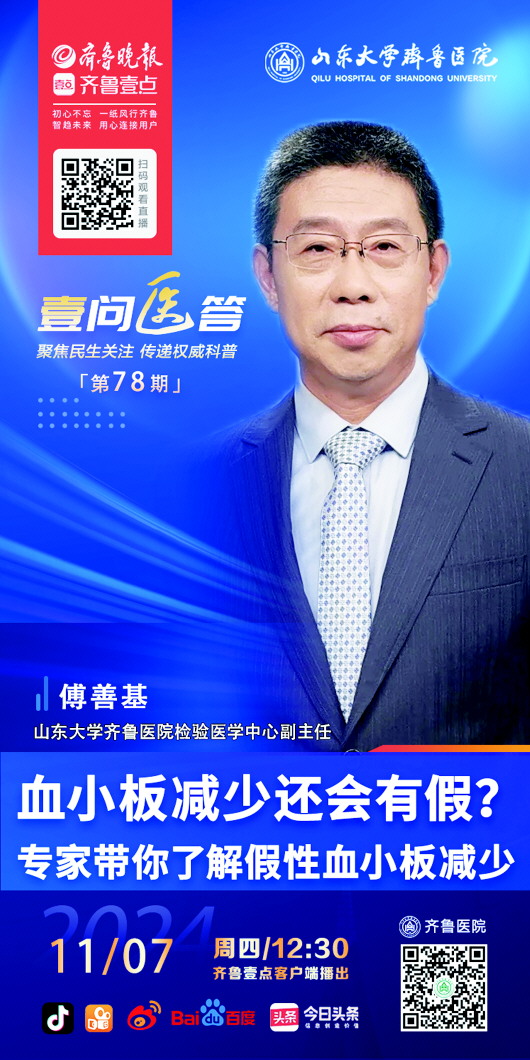 说到“血常规”大家都不陌生,无论是生病后的身体检查还是单位组织的集中体检,我们都能看到“血常规”这一项目。但是拿到检查报告后,对比自己检查报告的数值与正常参考值,一旦有所异常,很多朋友都会异常紧张。其中,血小板减少尤其会令人揪心。然而,血小板减少也可能存有“假”。11月7日,山东大学齐鲁医院检验医学中心副主任傅善基教授将做客“壹问医答”直播间,围绕血常规检查与假性血小板减少症进行科普讲座,敬请关注。