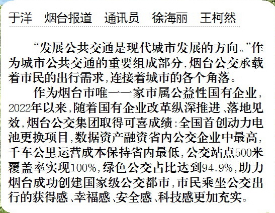作为烟台市唯一一家市属公益性国有企业,2022年以来,随着国有企业改革纵深推进、落地见效,烟台公交集团取得可喜成绩:全国首创动力电池更换项目,数据资产融资省内公交企业中最高,千车公里运营成本保持省内最低,公交站点500米覆盖率实现100%,绿色公交占比达到94.9%,助力烟台成功创建国家级公交都市,市民乘坐公交出行的获得感、幸福感、安全感、科技感更加充实。