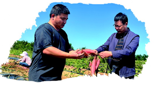 辛国胜(右)在给张新做“烟薯25”种植的技术指导。