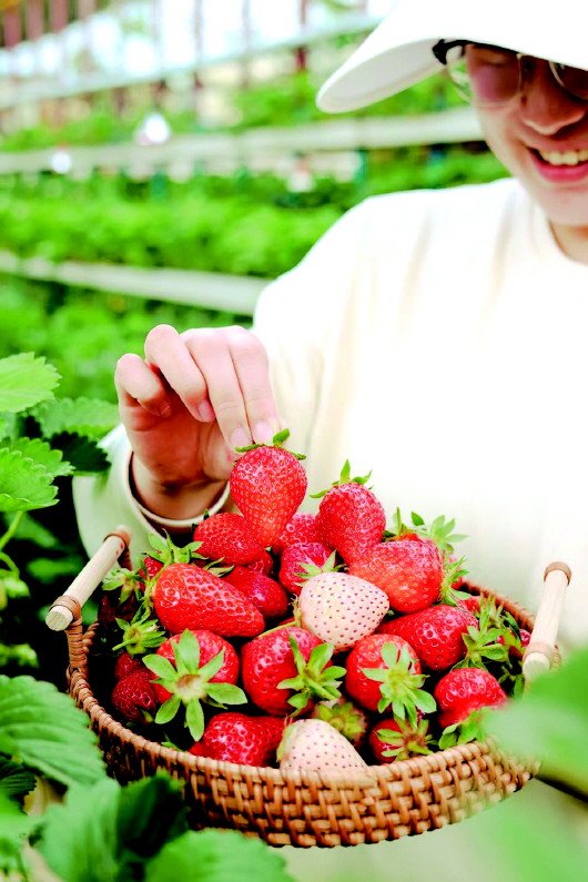 5月13日,福山一草莓园里,游客展示新鲜采摘的草莓。冉然 摄